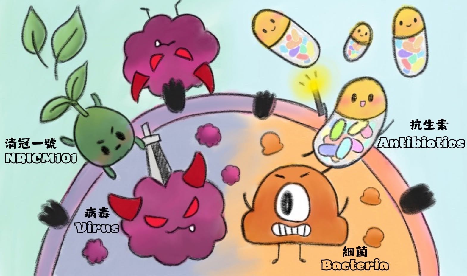 新冠疫情導致雙重感染與超級細菌增加,促使我們研究抗生素作用機制、細菌抗藥性與清冠一號療效。透過文獻回顧了解抗生素多種機制抑制細菌生長,細菌如何產生抗藥性,並認識COVID-19對抗藥性的影響及清冠一號多靶點抑制病毒與炎症的效用。希望未來能結合創新技術,應用於抗藥性與病毒治療領域,為醫療突破與公共健康改善作出貢獻。